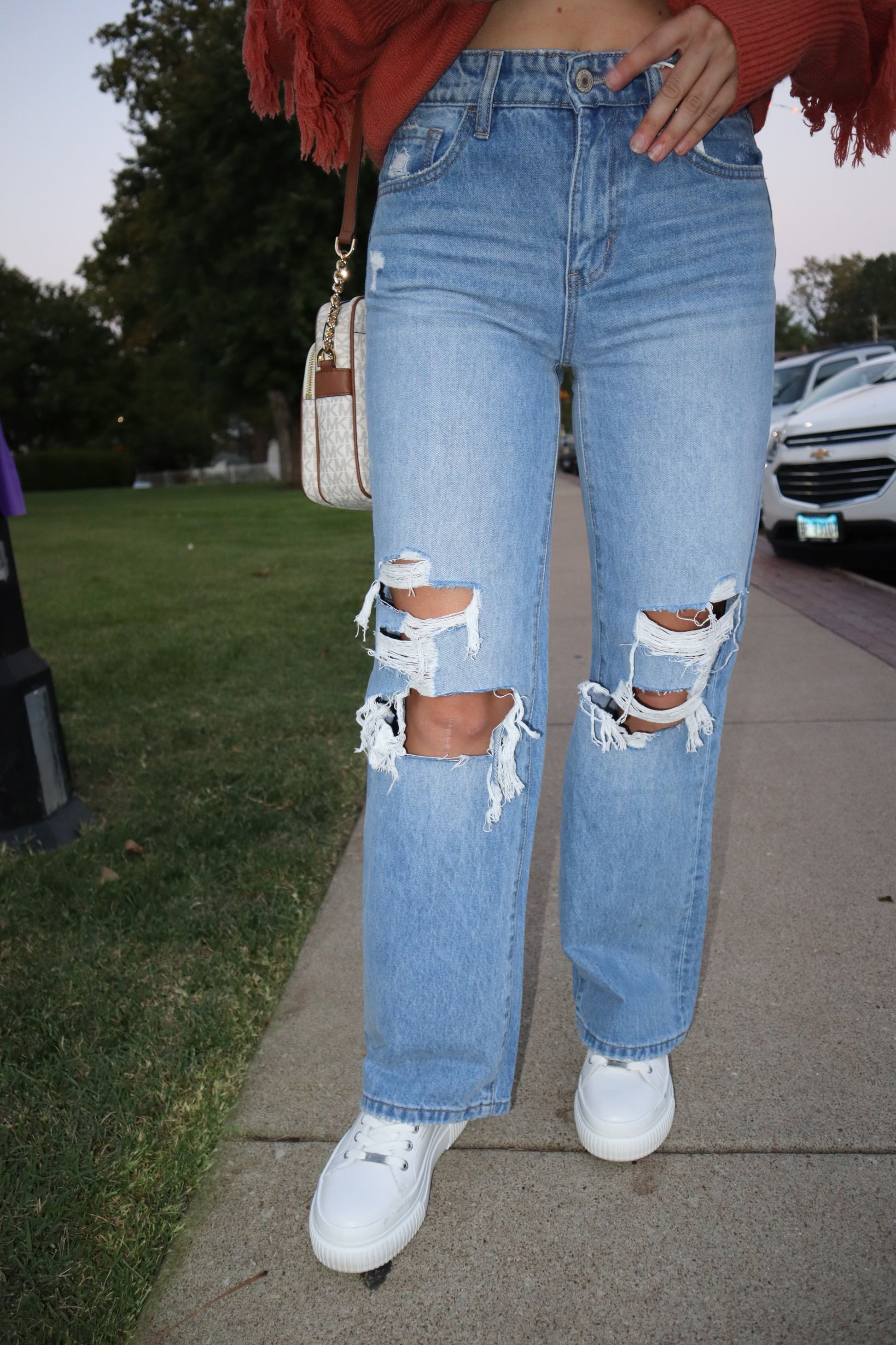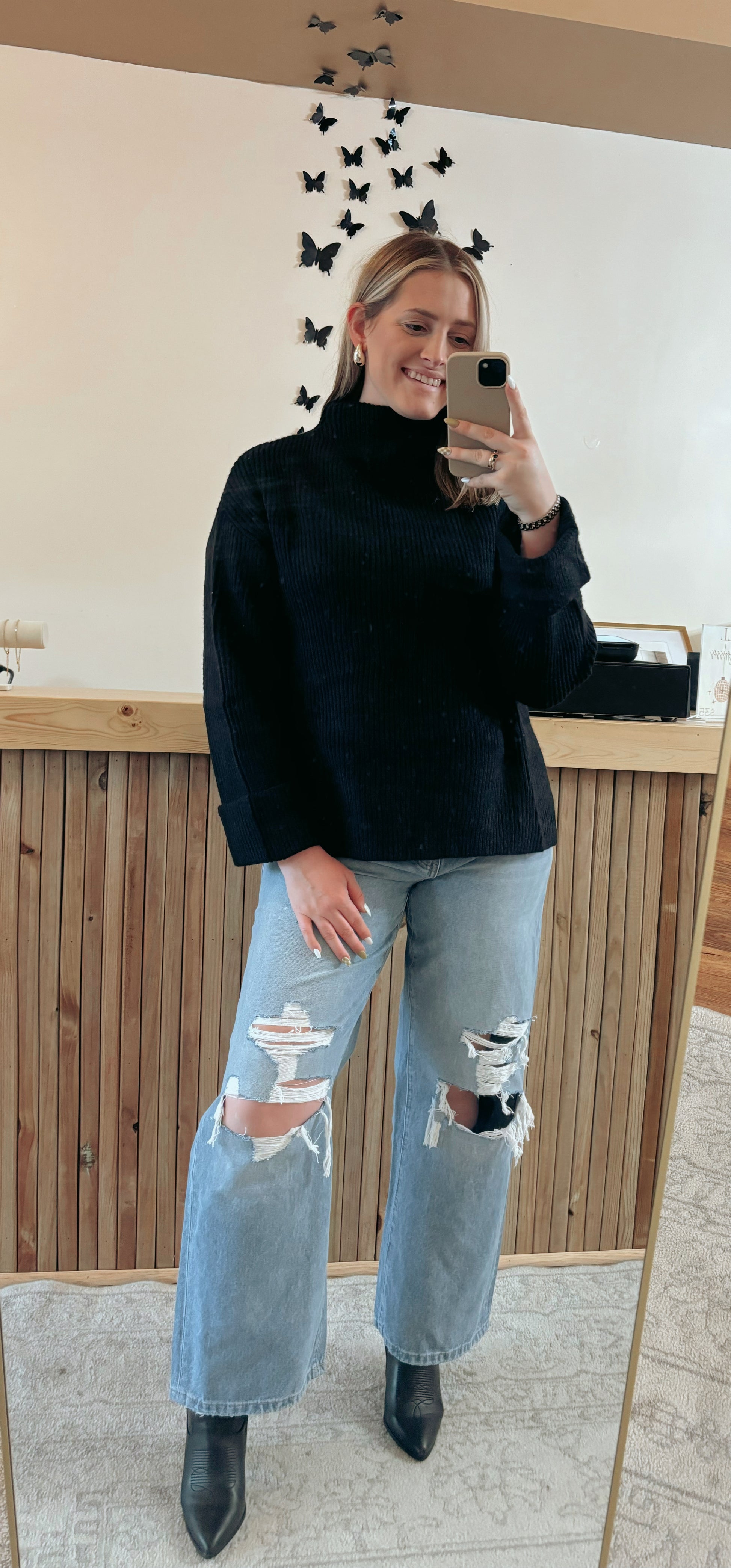 The high-rise waist and structured denim hug your curves in all the right places, while the distressed details and wide leg opening capture the essence of retro. Pair them with a tucked-in tee and heels for a chic, effortless vibe that turns heads wherever you go.